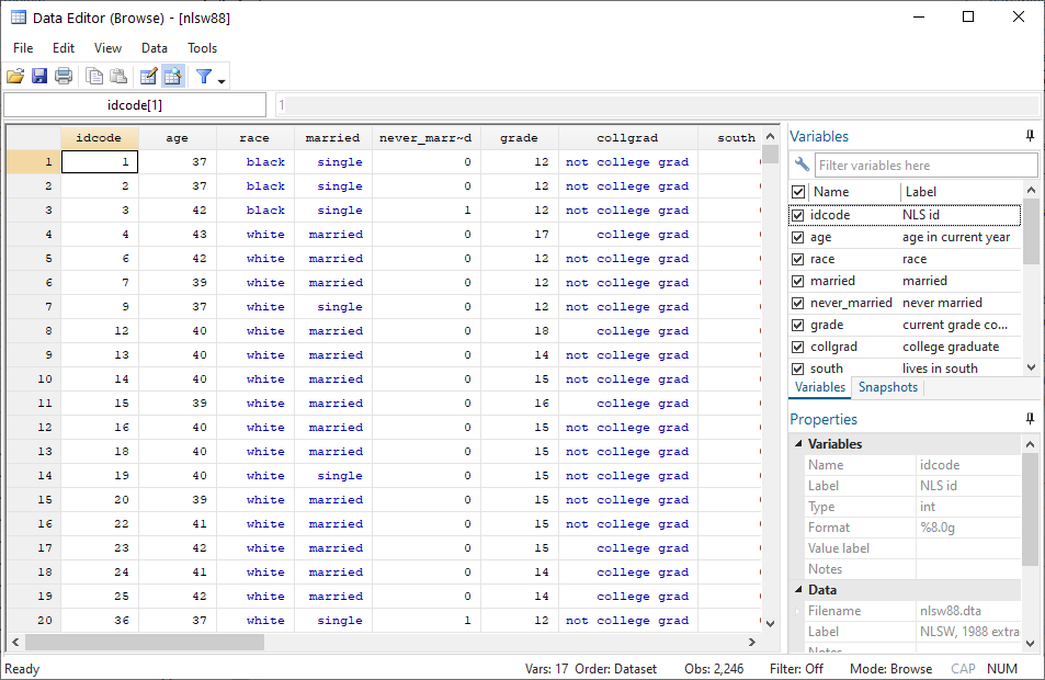 For this example, we will use the sample dataset nlsw88.dta in-built in Stata. We can access this dataset with the sysuse command. Add the clear option, if a dataset is already loaded in Stata.